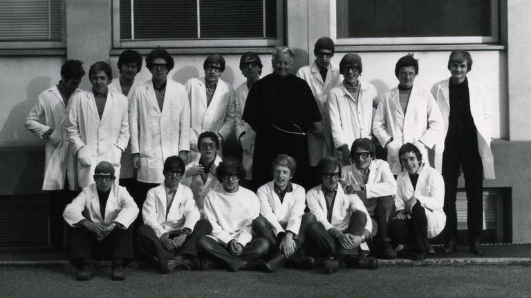 Nous voilà donc au grand complet, au sortir du cours de chimie encadrés et surveillés par notre prof d'allemand emblématique Luap.